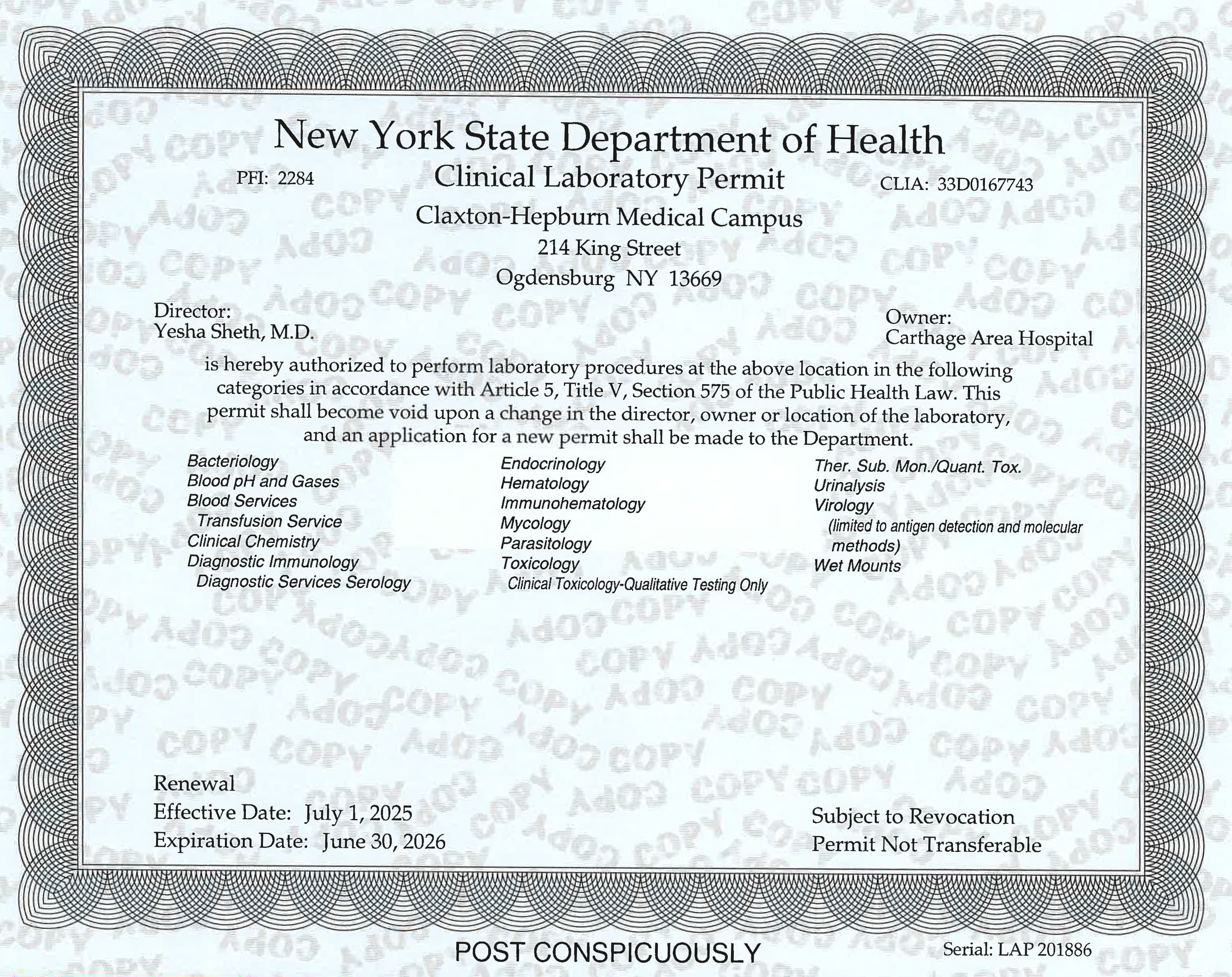The lab is licensed by the New York State Department of Health, and it is accredited by DNV.
